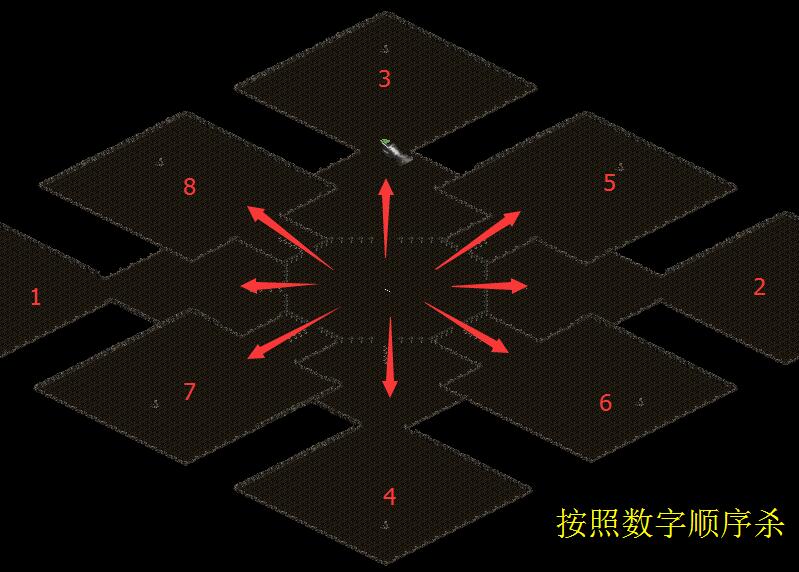 按照下图标识的数字顺序杀怪,否则无法破免,每杀死一只超强金怪会掉落任务品,请将该任务品与门票合成,否则也无法破免。
